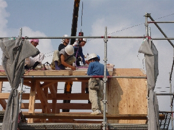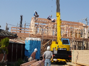 刻み加工した構造材を組上げる建前を行います。土地柄により棟上式を行うところもあります。